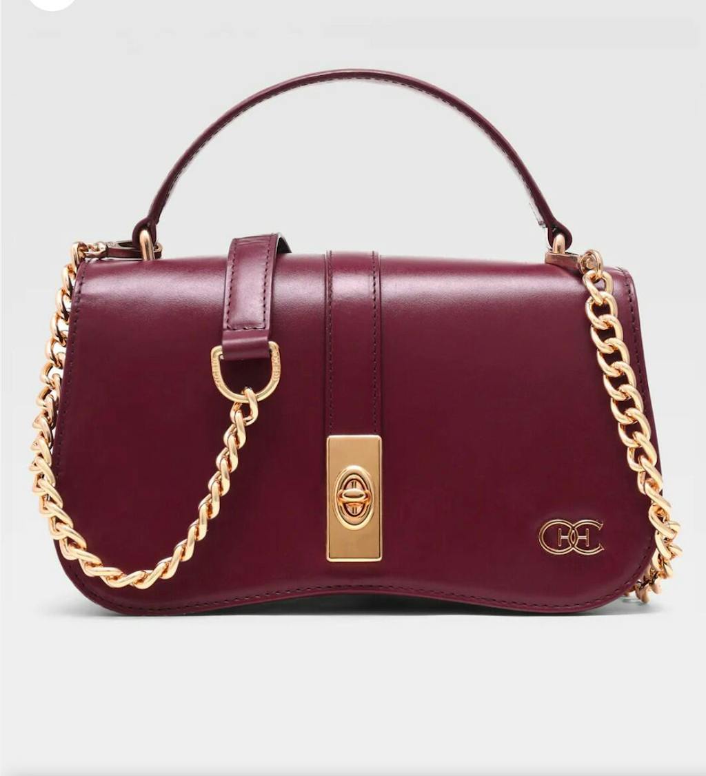 • Leather shoulder strap with gold chain.